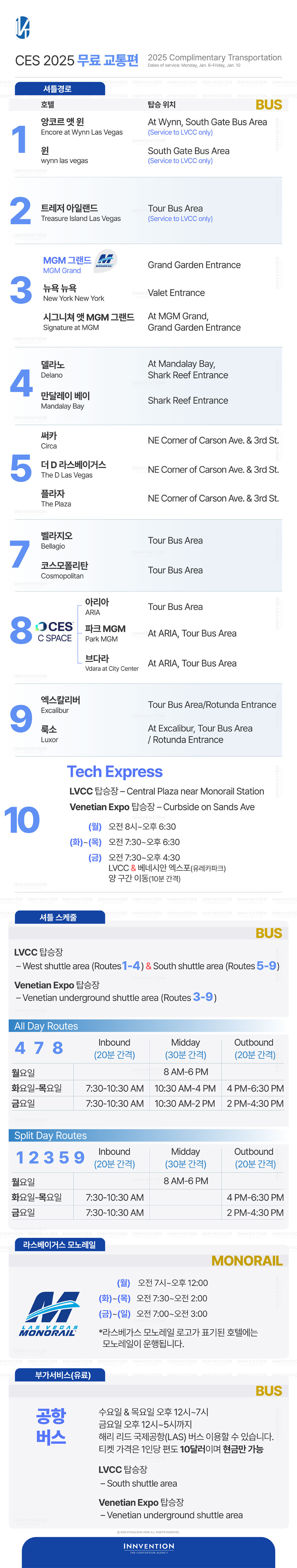 2025년 1월 6일 월요일부터 1월 10일 금요일까지(현지) 일부 공식 CES® 호텔에서 LVCC 및 베네시안 엑스포를 오가는 무료 셔틀 서비스가 제공됩니다.