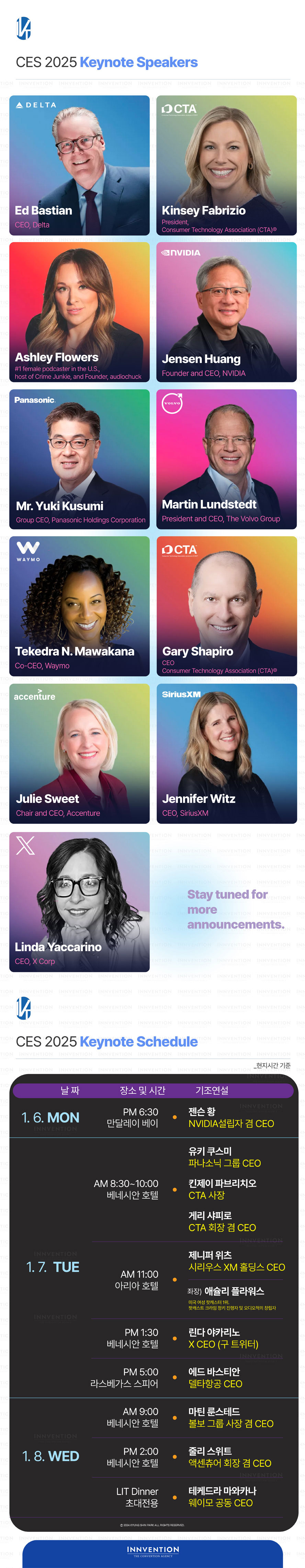 이어 볼보 그룹 사장 겸 CEO인 마틴 룬드스테트가 CES 2025 기조 연설자로 여러 영향력 있는 연설자와 함께 기조 연설을 발표합니다. 여기에 엔비디아 최고경영자(CEO) 젠슨 황도 CES 2025의 기조연설자로 합류한다고 밝혔습니다. CTA는 젠슨 황에 대해 미래 지향적 접근 방식과 기술에 대한 열정으로 유명하고 포춘지와 이코노미스트가 선정한 최고의 CEO이자 타임지 선정 세계에서 가장 영향력 있는 100인中 한 명이라고 소개했습니다. 이 외 CTA 회장 게리샤피로, CTA 사장 킨제이 파브리치오 파나소닉 CEO 유키 쿠스미, 액센츄어 CEO 줄리 스위트가 기조 연설로 나섭니다. https://www.ces.tech/ 인용
